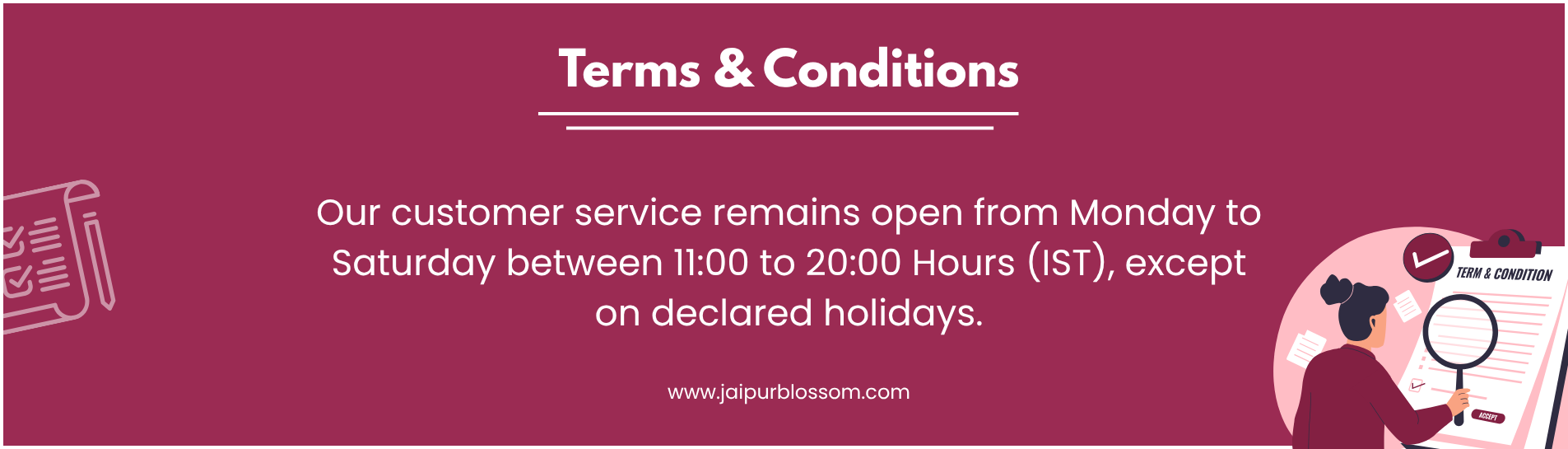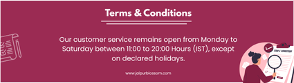 For all customer service enquiries, please WhatsApp or call us at or email us at jaipurblossom@gmail.com - our customer service remains open from Monday to Saturday between 11:00 to 20:00 hours (IST), except on declared holidays.