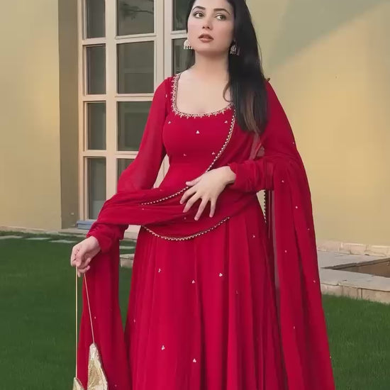 Elevate your elegance with this hand-embroidered designer gown crafted from soft faux georgette. Adorned with real diamond and pearl detailing, it offers a luxurious shimmer that catches every eye. The gown’s flattering 4.5-meter flair pairs beautifully with the comfortable micro cotton pants featuring a full stitch and elastic waist. Complete the look with a matching faux georgette dupatta embellished with rivet pearls and diamond accents, finished with delicate lace embroidery on all sides. Perfect for special occasions, this ensemble blends comfort with exquisite craftsmanship.