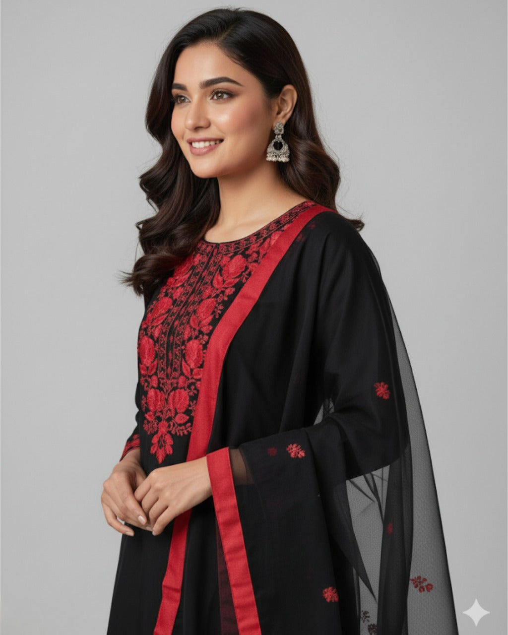 Elevate your festive wardrobe with this Chic Designer Heavy Embroidered Top-Plazzo set. The top features luxurious heavy faux georgette adorned with intricate embroidery and lined with soft micro cotton for comfort, measuring 45-46 inches in length. Available in sizes M to XXL with full stitching. Paired with matching heavy faux georgette plazzos featuring a comfortable elastic waist and micro cotton lining, 40 inches long. Completing the set, a heavy faux georgette dupatta with an elegant four-side lace border, stretching 2.20 meters. Perfect for a striking and comfortable festive look.