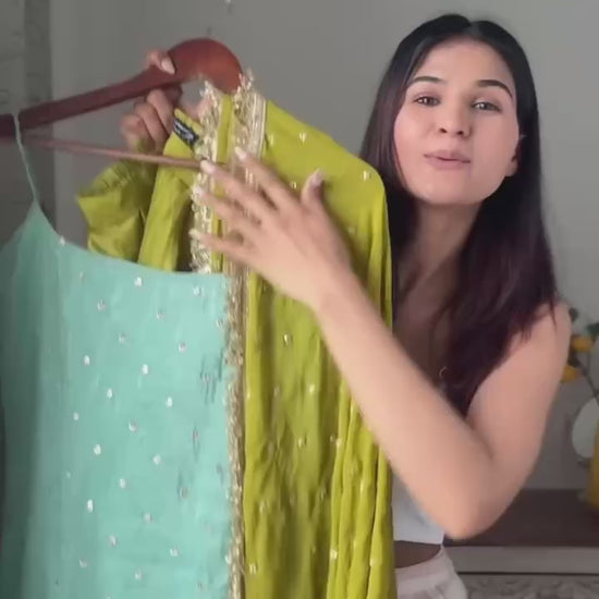 Elevate your style with this Luxury Chinon Silk Suit Set featuring exquisite sequin and thread embroidery. The top, crafted from soft Chinon silk with a micro cotton lining, offers a comfortable 40-inch length and includes an extra inner sleeve for added elegance. The fully stitched Chinon silk plazo ensures a flattering fit up to size 44, enhanced by a stretchable elastic waist and a 38-inch length for ease of movement. Completing the set is a 2.2-meter Chinon silk dupatta adorned with sequins and detailed four-side embroidery, perfect for a graceful, polished look.