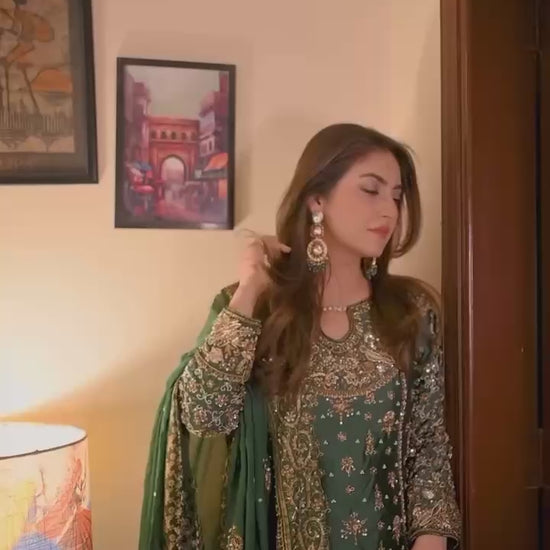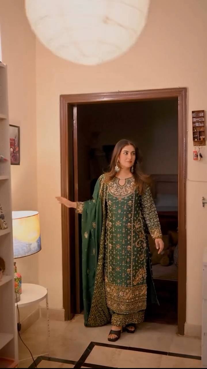 Pant • Fabric: Heavy Faux Georgette with 5mm embroidery sequin work • Inner: Heavy Micro Cotton • Length: 40–41 inches • Fully Stitched
